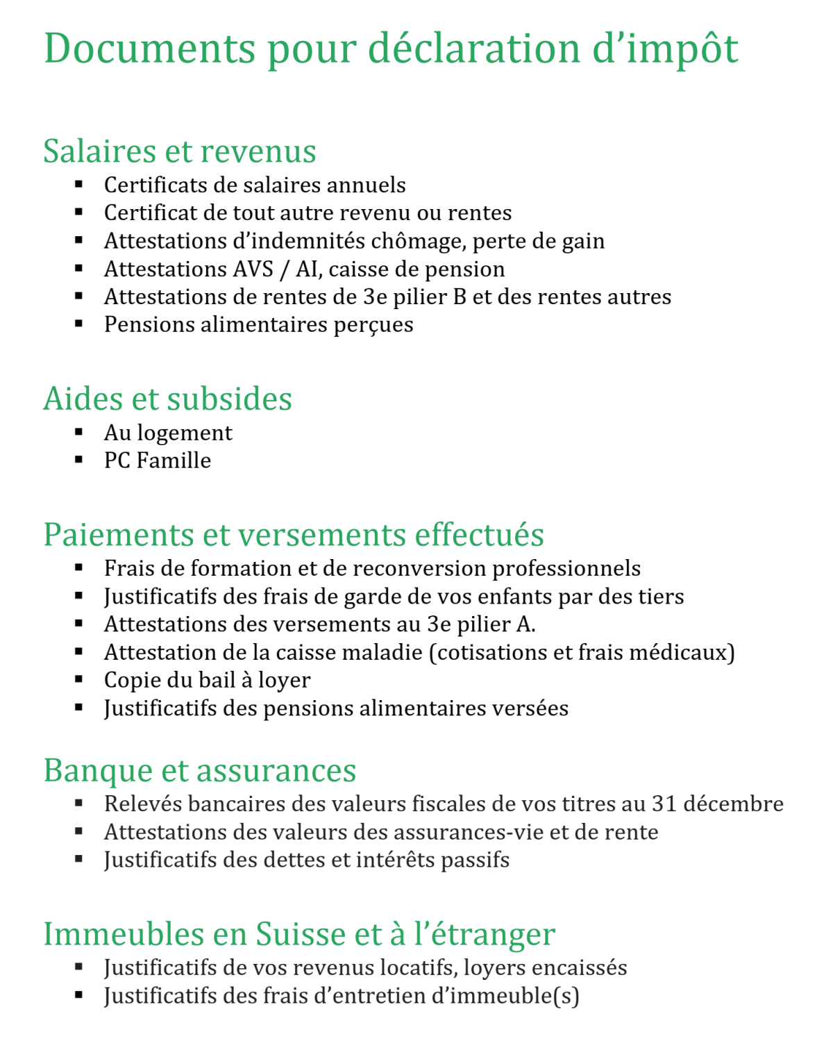 Nous préparons et envoyons dans le temps votre déclaration d'impôts à l'ACI (Administration Cantonale des impôts) tout simplement.